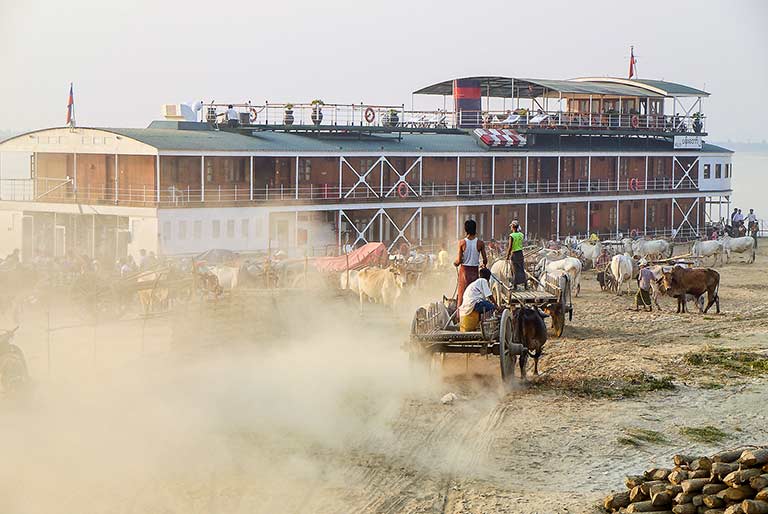 Other excursions from the mothership included rides on cycle rickshaws through the Cambodian capital Phnom Penh, and across rice fields in ox-carts, walking in villages and through markets, visits to family houses, to palaces and temples, visits by small boat to floating and stilt villages, and a peaceful sampan journey through the inland waterways of the delta.