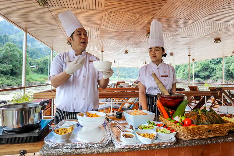 Today we sail the final leg of our journey upstream toward Huayxay. Cross over into Thailand via the Thai-Laos Friendship Bridge before rejoining your ship in Chiang Khong. Enjoy a ship tour of your Pandaw vessel and fruit carving demonstration from your Pandaw Chef. Farewell cocktails and Thai traditional dance on board for your last evening.