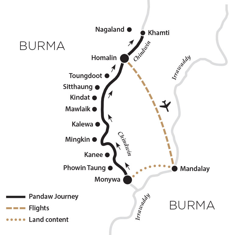 For the first time, sail the entire Chindwin river from Monywa to Nagaland on this limited 14-night combo expedition aboard the 10-cabin Zawgyi Pandaw. Take your time to explore one of the most remote and beautiful regions of Asia as we sail slowly along the Irrawaddy’s main tributary, only accessible with ultra-low-draft vessels such as ours. We will visit remote villages, pass through dramatic gorges and breath-taking scenery as well as explore the ancient Nagaland region, famous for its fierce and distinctive Naga Warriors.