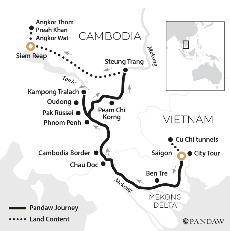 In the morning, we take minivans for a short drive to Sam Mountain, the location of Phuoc Dien Tu or the Hang Pagoda. After climbing the steps we are greeted with stunning views across the Mekong. For those not keen on the stairs, explore the local market instead. Afterwards, we visit the nearby floating fish farms by Sampan before being treated to a private Lion dance performance at a local Village. Upon return to the ship, we navigate a web of canals before dropping anchor on the Vietnam/Cambodia border to undergo Immigration formalities.