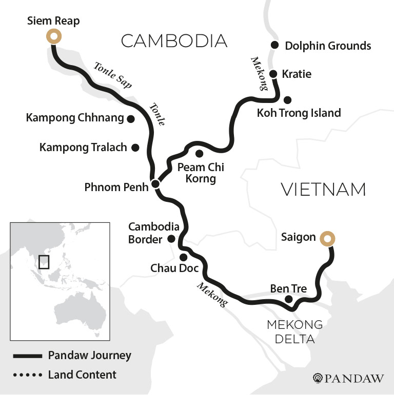 Sailing port to port from central Saigon to Siem Reap inland port, venture deep into Vietnam’s vast Mekong Delta, explore the norther reaches of the Mekong River at the dolphin grounds at Kratie and discover the picturesque Tonle Sap as we cross the the 150 mile-long lake. This is a new itinerary never attempted in total before and only operable aboard Pandaw’s ultra-low draft vessels and only during the high water season until October.