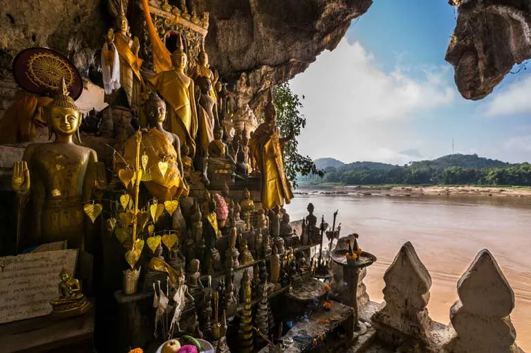 After a final morning at leisure in Luang Prabang, we set sail at midday, continuing our journey upstream. In the afternoon, we board a local boat to explore the unique Pak Ou Caves. Set in a dramatic limestone cliff face at the confluence of the Mekong and Ou rivers, these two caves are a Buddhist sanctuary filled with thousands of Buddha images of all shapes and sizes, left by pilgrims over hundreds of years. Afterward, we visit the nearby "Whisky Village" (Ban Xang Hai) to see the production of the local lao-lao rice spirit and browse for local handicrafts.