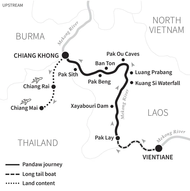 Enjoy the splendour of Laos on Pandaw's 10 night expedition on the Upper Mekong. Sailing between Chiang Khong on the Thai-Laos border, and through Laos toward Vientiane, the old French capital, you will witness stunning scenery, meet amazingly warm and friendly locals and learn about Laos’ national animal, the majestic elephant. We stop for three nights at the UNESCO World Heritage City of Luang Prabang with its dazzling wood-carved monasteries before heading deep into the mountains, through rapids and gorges on our high-powered little Pandaw vessels.Please note: During the months February to April there may be an increased risk of smog across Laos and northern Thailand. This is due to the annual crop burnings and whilst usually mild, can sometimes be quite severe. We would advise that any passengers with respiratory issues consult with their doctor before booking for this period. Most departures and travellers will be unaffected, however.