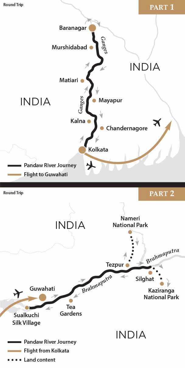 There can be no river in the world as sacred as the Ganges and an expedition on the Lower Ganges or Hooghly is one of the prettiest river journeys imaginable. The river wends its way through the lush countryside of West Bengal with its culturally significant towns crammed with temples and palaces. A rich and vibrant rural life abounds and there is never a dull moment as we sedately ply this pleasant waterway. Combine this with the mighty Brahmaputra river in Northern India which originates high in the Himalayas before flowing through the scenic Assam Valley where UNESCO protected national parks and remote rural communities provide the traveller with the most wonderful and authentic expedition.
