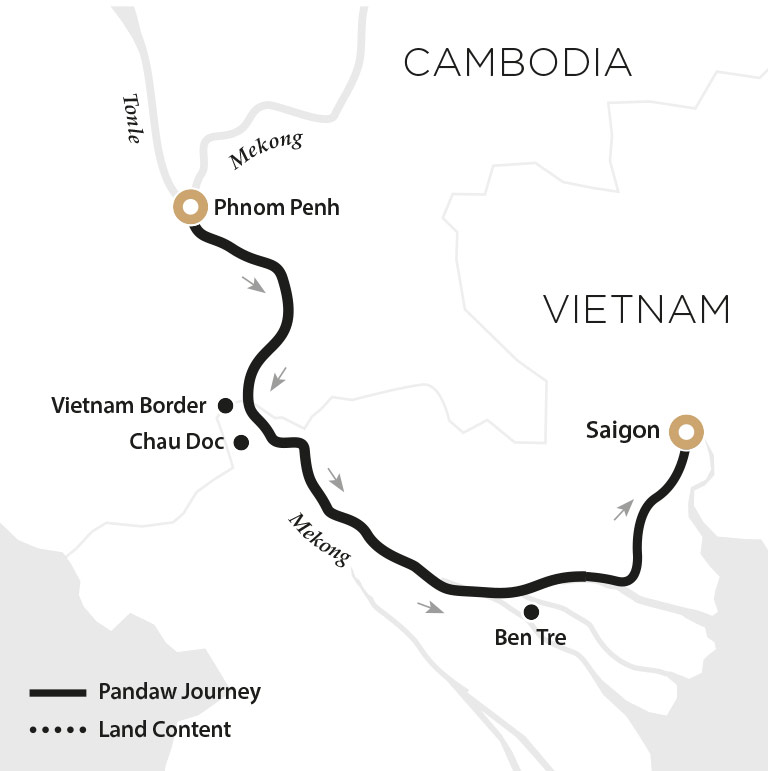 There can be no tapestry of river life as fascinating and varied as the Mekong River bringing together bustling Vietnam Delta and the tranquility of Cambodia. This three to four night cruise departs from downtown Saigon sailing through the vast delta so rich in human life and endeavor, to travel along the main channel into the rich countryside of Cambodia ending in the country's capital of Phnom Penh.