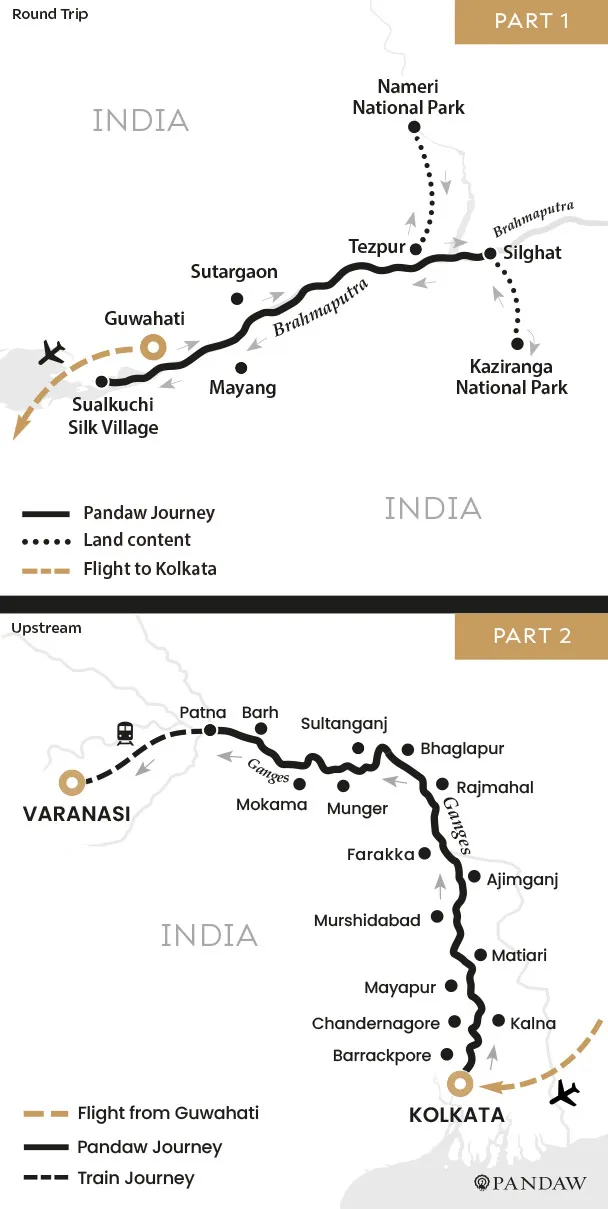 Cruise Price Excludes: Flights, port dues (if levied), laundry, all visa costs, fuel surcharges (see terms and conditions), all beverages except local mineral water, jugged coffee, teas & tisanes and tips to tour guides, local guides, bus drivers, boat operators and cyclo drivers.What to NoteWe suggest to change money at a bank or withdraw cash from an ATM at the international airport before exiting.The weather in Assam can be unpredictable and can be cool of an evening. Between December and February it can be particularly cold and we advise bringing warm weather attire for sailings during these months.The Brahmaputra River is a fast flowing and changeable river. Navigable channels can change overnight meaning amendments to excursions, sailing times and mooring locations can occur with little warning. We will endeavour to fulfil all stated excursions or suitable replacements where possible, but a flexible approach is required for sailing on the Brahmaputra.The Upper Ganges segment of this itinerary passes through the state of Bihar. In this state it is illegal to serve any drinks containing alcohol. For this reason we will not be able to serve alcohol onboard the ship. Entry to the Bihar School of Yoga is subject to approval and may not always be possible. 1st Class train tickets are subject to availability.Comprehensive health insurance, including cancellation insurance is strongly recommended for all Pandaw expeditions.River cruising on the Lower and Upper Ganges can be severely affected by fog during the months of December and January. This may impact the sailing schedules and the planned excursions. While every effort will be made to make up time and include all activities this is not always possible. Similarly temperatures can drop significantly overnight and in the early mornings, though during the day warmer temperatures can be expected. Winter temperatures can be below average with many destinations in Bihar and Uttar Pradesh experiencing long spells of cold.