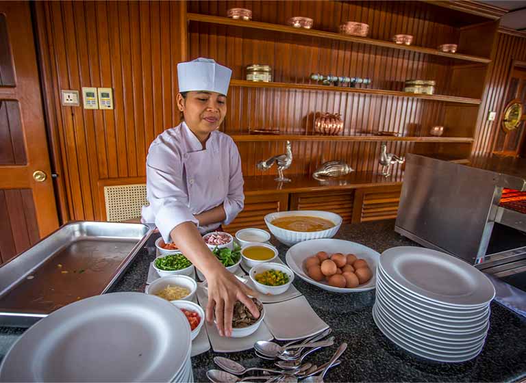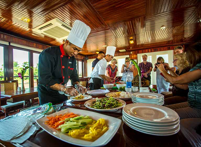 While many guests enjoy the tranquility of reading, writing, or photography, others take part in the informal, yet engaging experiences offered on board. Daily briefings hosted by your purser and travel guides provide insights into each day’s itinerary and local context, while themed evenings and hands-on demonstrations bring the spirit of the region to life. These activities are always optional, allowing you to participate as much—or as little—as you like.