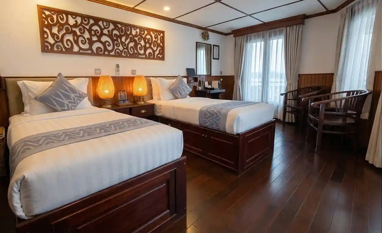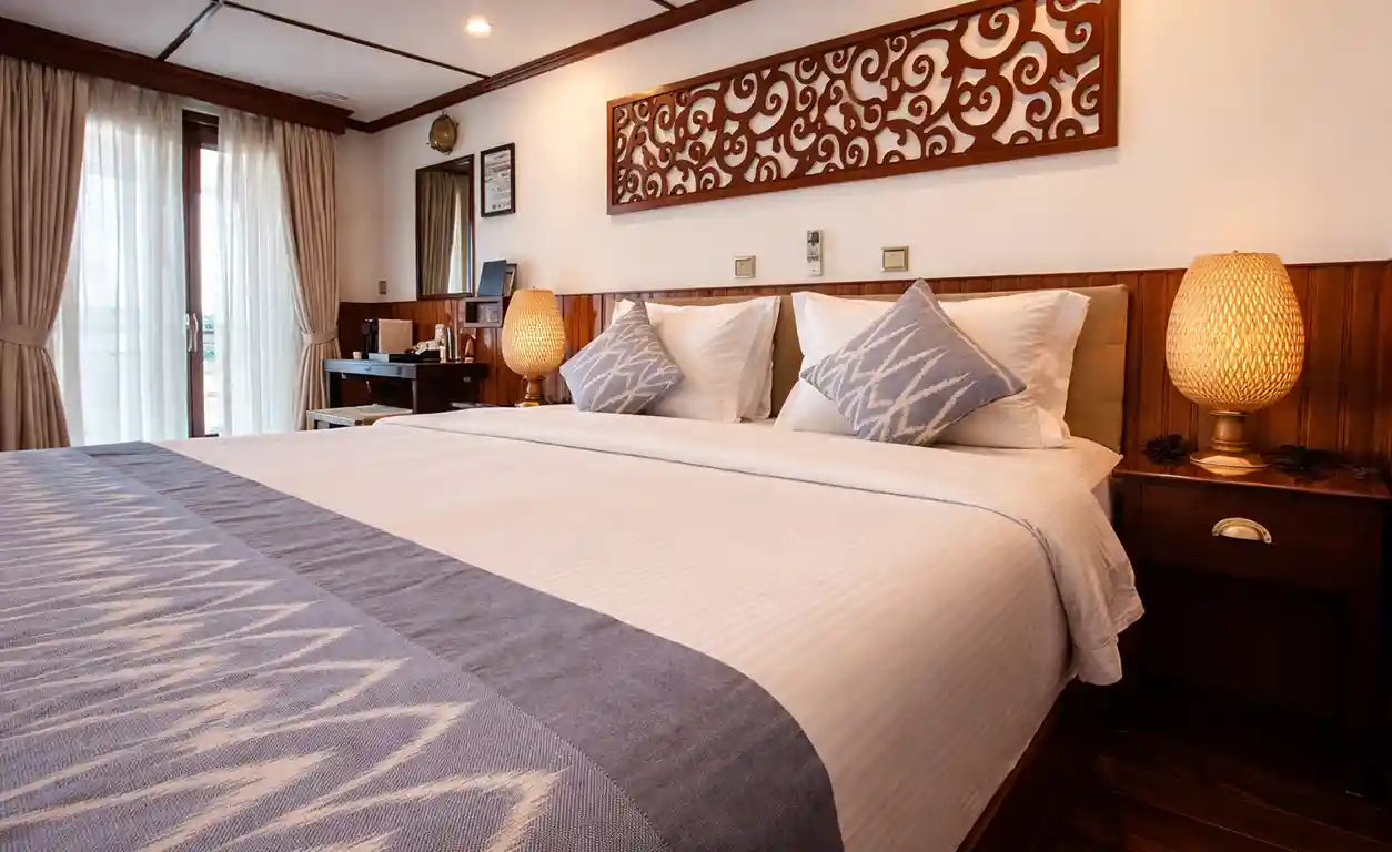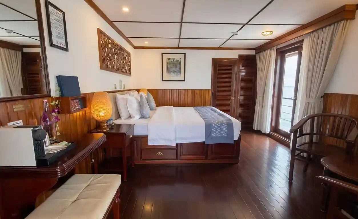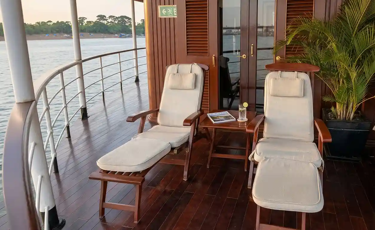 The Bassac Pandaw premium staterooms are 205 square feet (19.2 sqm) and are 20% larger than the standard upper deck cabins with french doors to an observation deck over the ship's bow and additional seating within in addition to all the usual features of the Pandaw stateroom that include Nespresso machine, tea maker, minibar etc.