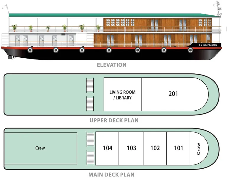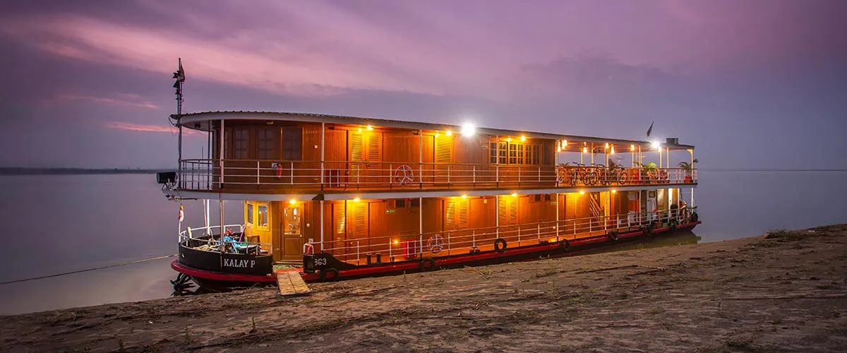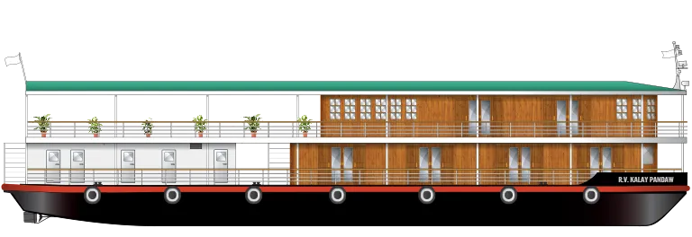 The Kalay Pandaw was built in Mandalay in 2013 by our own team from within the company. This river yacht was built for private friend and family charters with just six staterooms including once huge ‘Owner’s Suite’ on the upper deck. This is probably our most charming and fun ship. Most passengers prefer to eat on the open deck though when cold up river in winter it is possible to sit everyone down in the little saloon. With her very light draft the Kalay has these past years been on the Upper Chindwin.