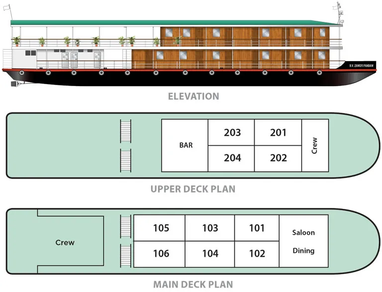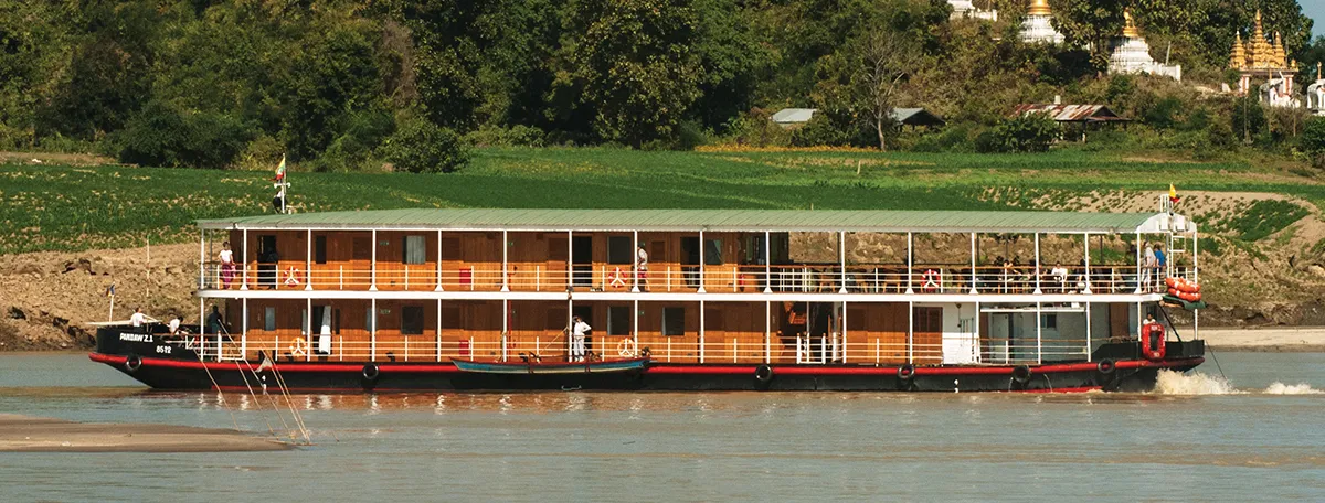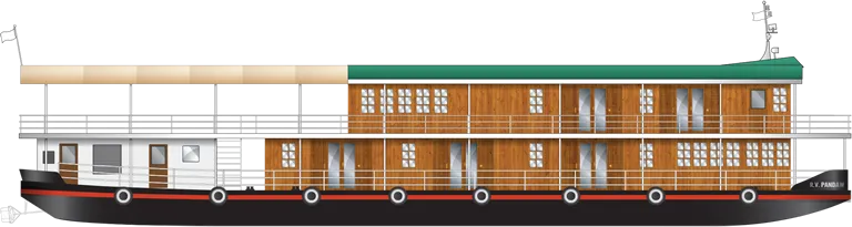 In 2015 we added an upper deck with further cabins and a flexible bistro area in addition to the observation saloon on the main deck. The Zawgyi wins the prize for the shallowest draft in the fleet at 2.5ft and therefore we have her deployed on the treacherous Chindwin River niftily negotiating treacherous shoals.